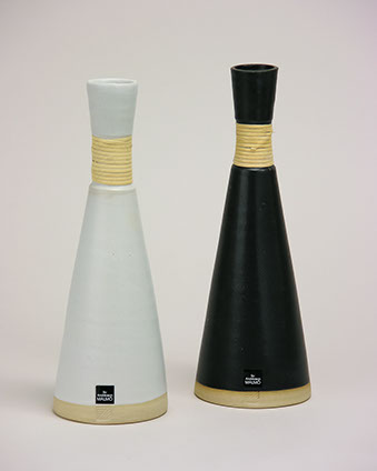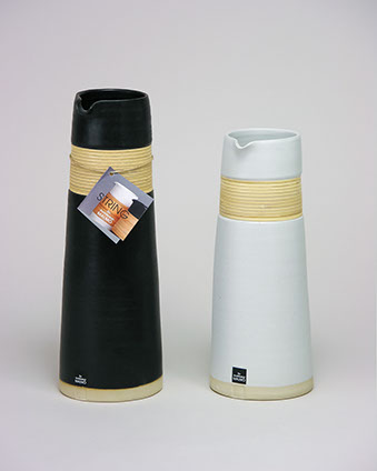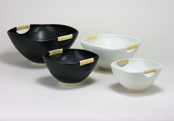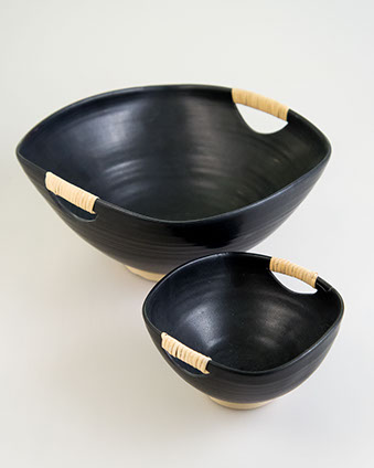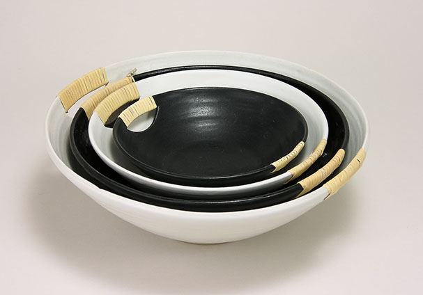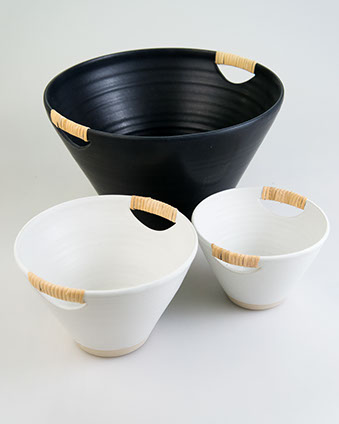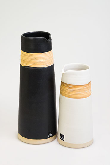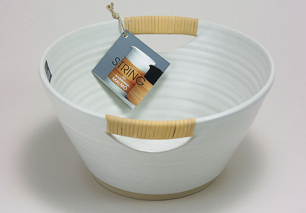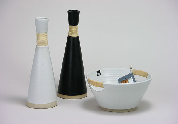 Det föll sig naturligt att använda rotting som grepp på karaffer och skålar.